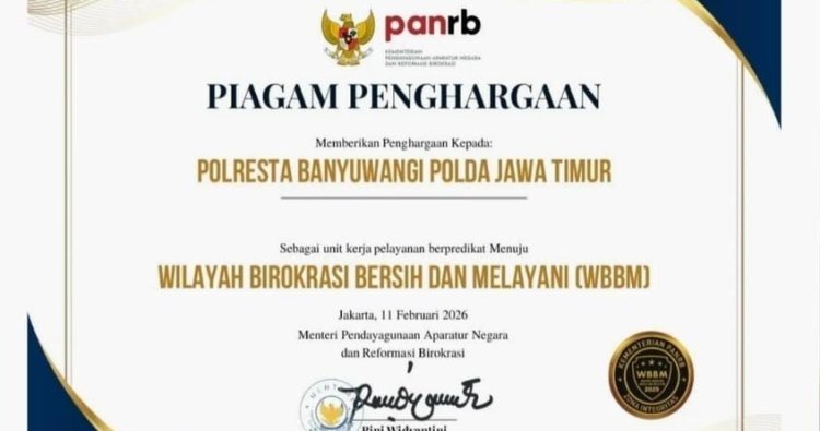BANYUWANGI – Polresta Banyuwangi Polda Jawa Timur kembali menorehkan sejarah dengan meraih penghargaan Zona Integritas (ZI) Menuju Wilayah Birokrasi Bersih dan Melayani (WBBM) Tahun 2025, Kamis (11/2/2026)